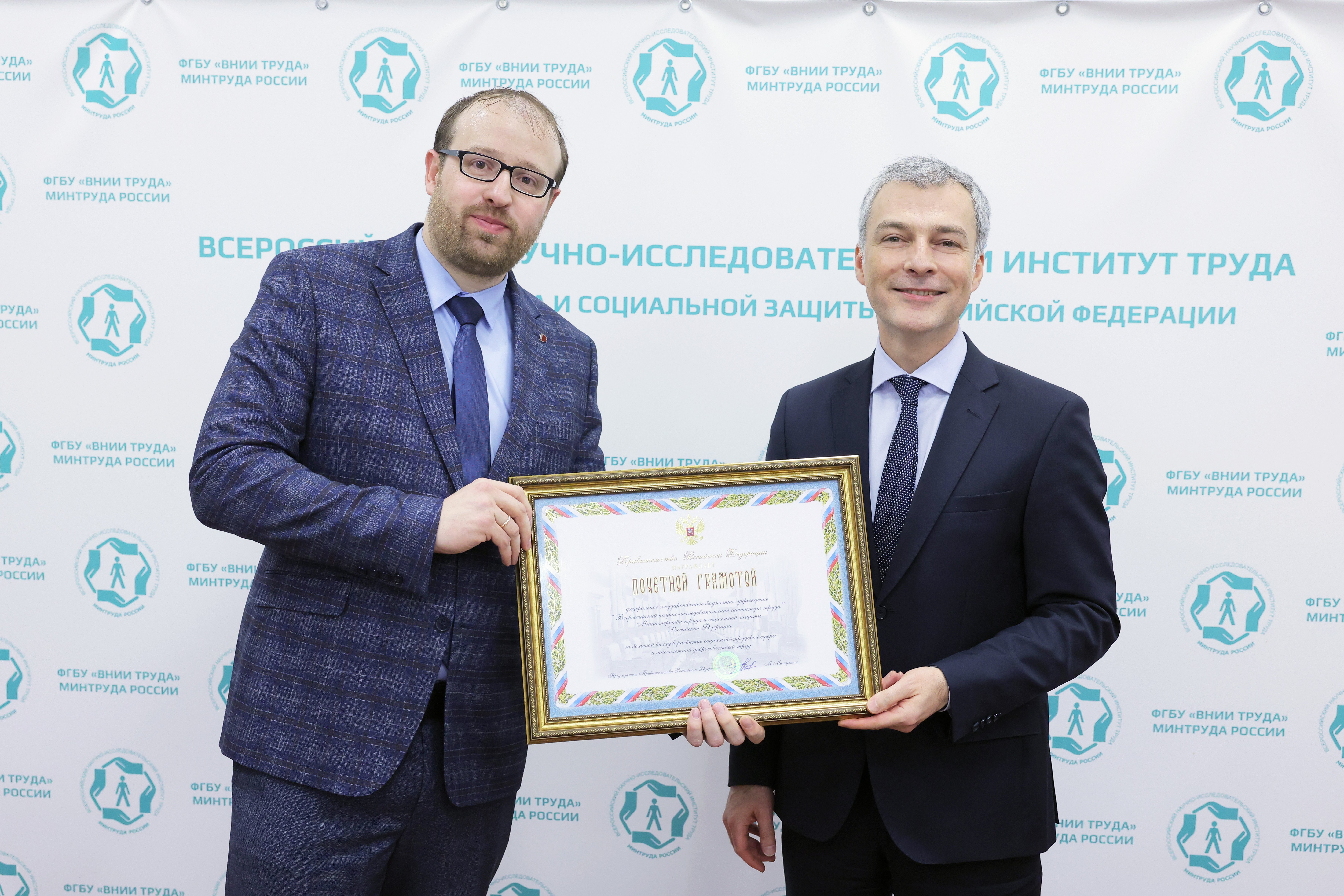 За большой вклад в развитие социально-трудовой сферы и многолетний добросовестный труд Правительство Российской Федерации наградило ФГБУ «ВНИИ труда» Минтруда России Почетной грамотой. Награду Институту труда 26 декабря вручил Заместитель министра труда России Дмитрий Платыгин.